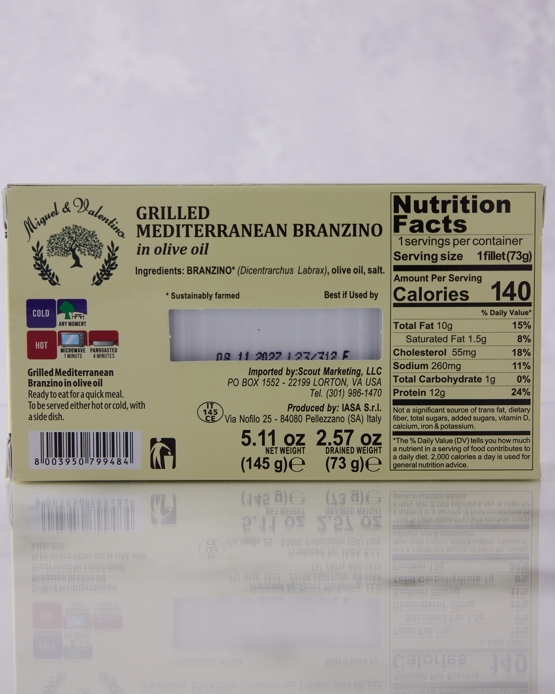 A Mediterranean classic, this branzino (European sea bass) is delicately grilled and preserved in olive oil for a light, flaky texture and clean, savory flavor. Miguel & Valentino capture the essence of coastal Spain in a ready-to-serve tin that’s elegant yet effortless.
