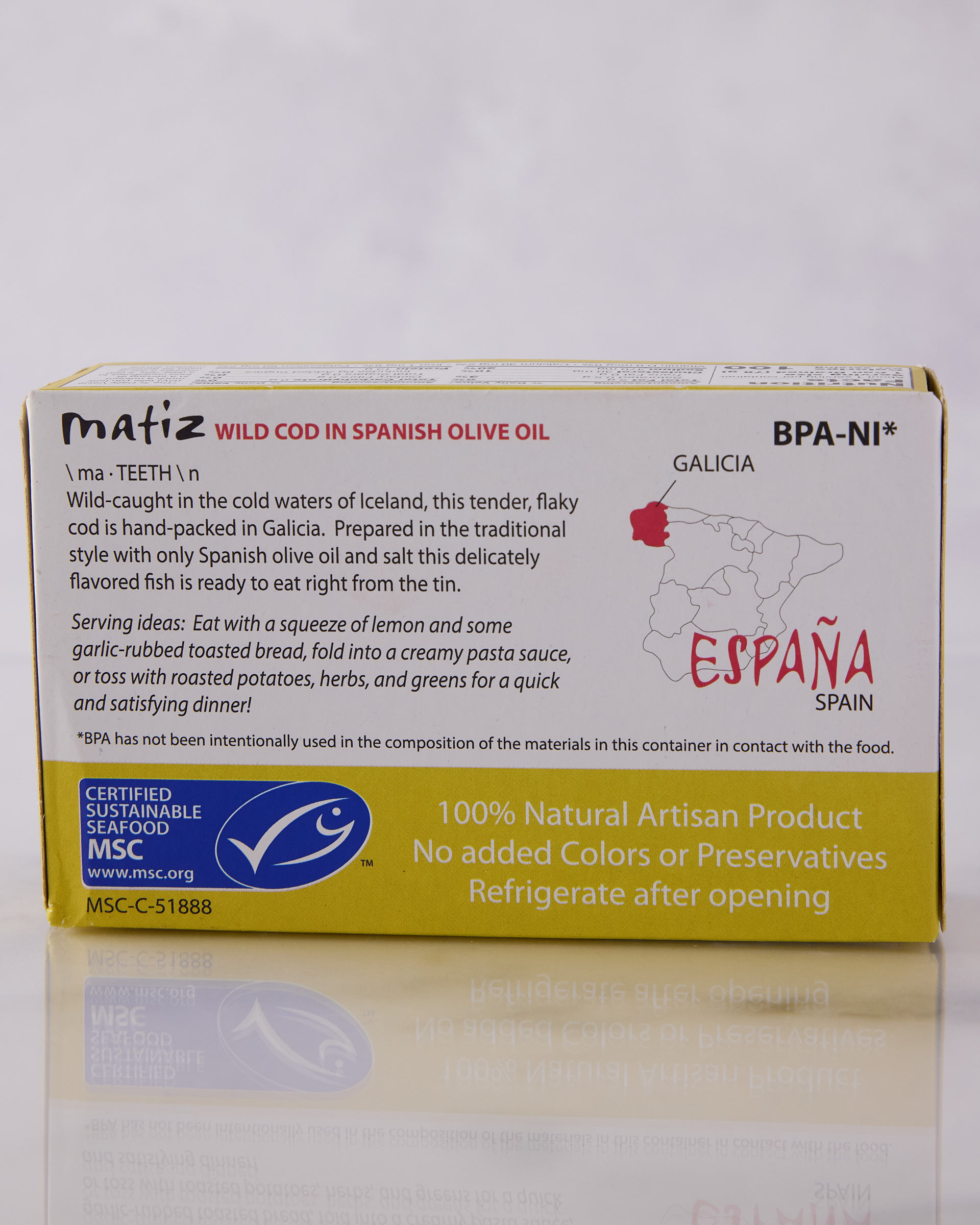 Harvested from the cold waters of the North Atlantic, Matiz Wild Cod is hand-prepared and preserved in smooth Spanish olive oil. Flaky, tender, and delicately flavored, this conserva highlights the purity of the fish with the richness of olive oil.