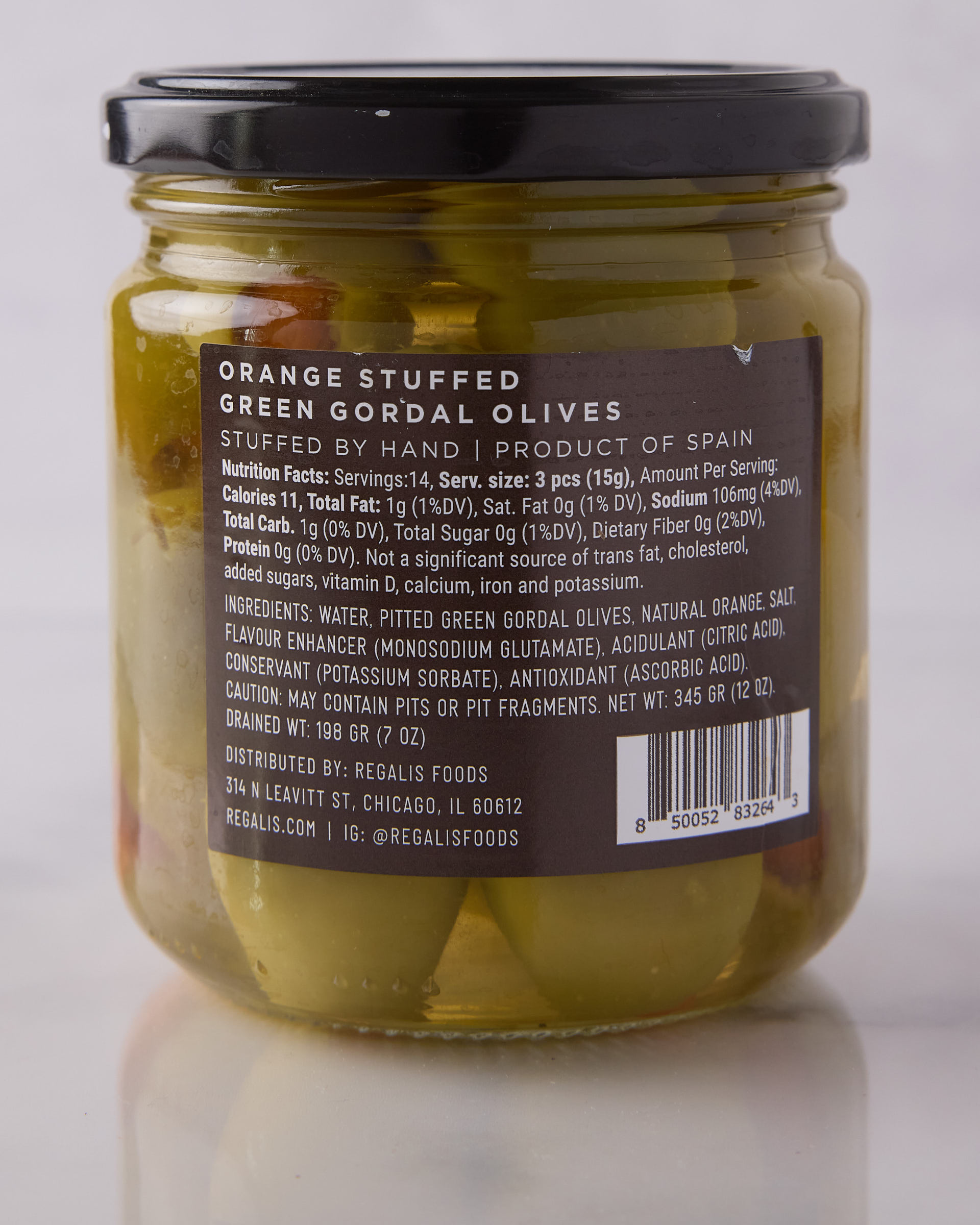 Plump Spanish Gordal olives meet the bright citrus aroma of Navelina orange peel in this unique Regalis specialty. The result is a meaty, buttery olive with a fragrant, zesty finish — equal parts savory and refreshing.