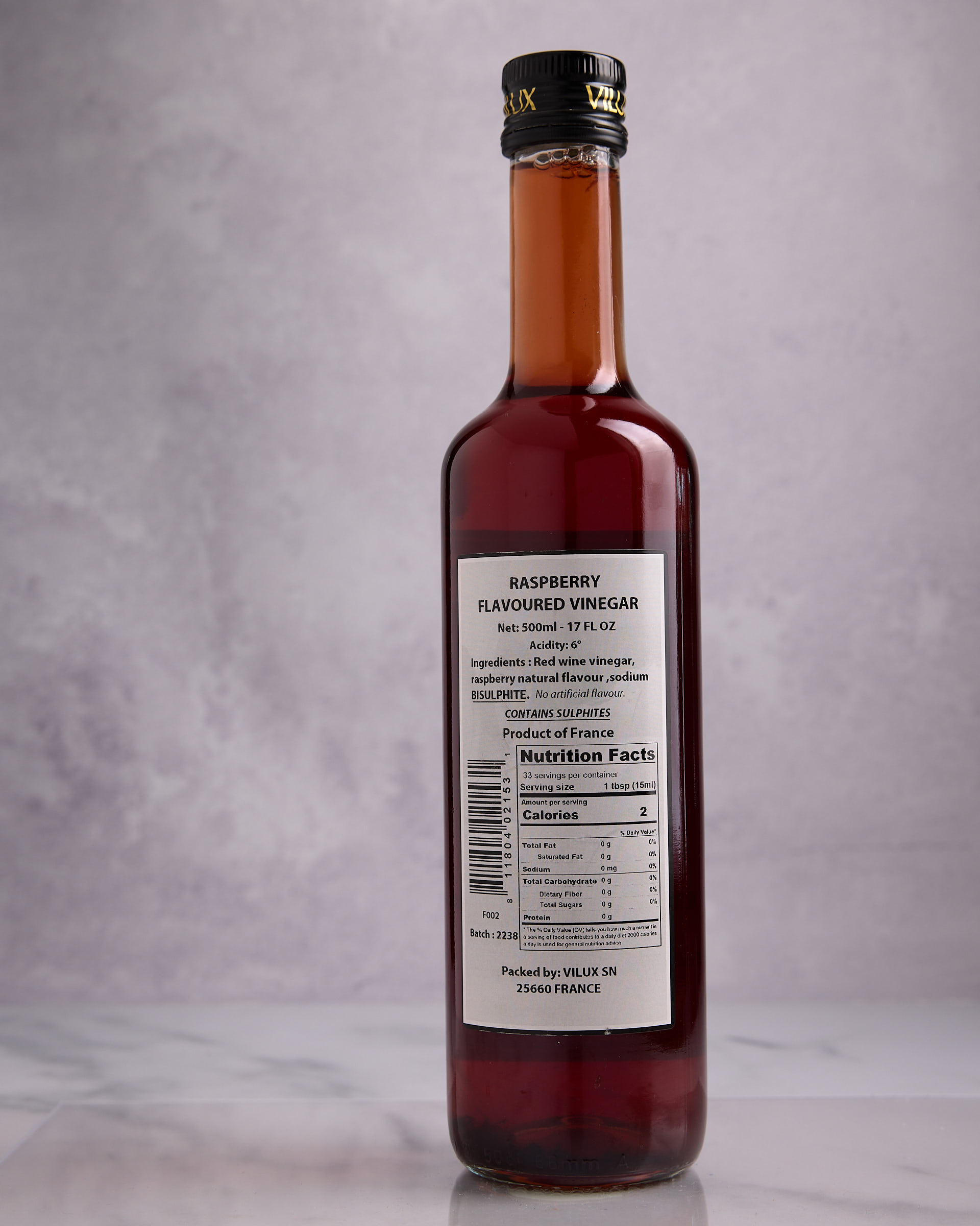 Bright and tangy with a hint of sweetness, Vilux Raspberry Vinegar is made in France from ripe raspberries for a fruit-forward flavor. Its vibrant character adds freshness and color to both savory and sweet dishes.